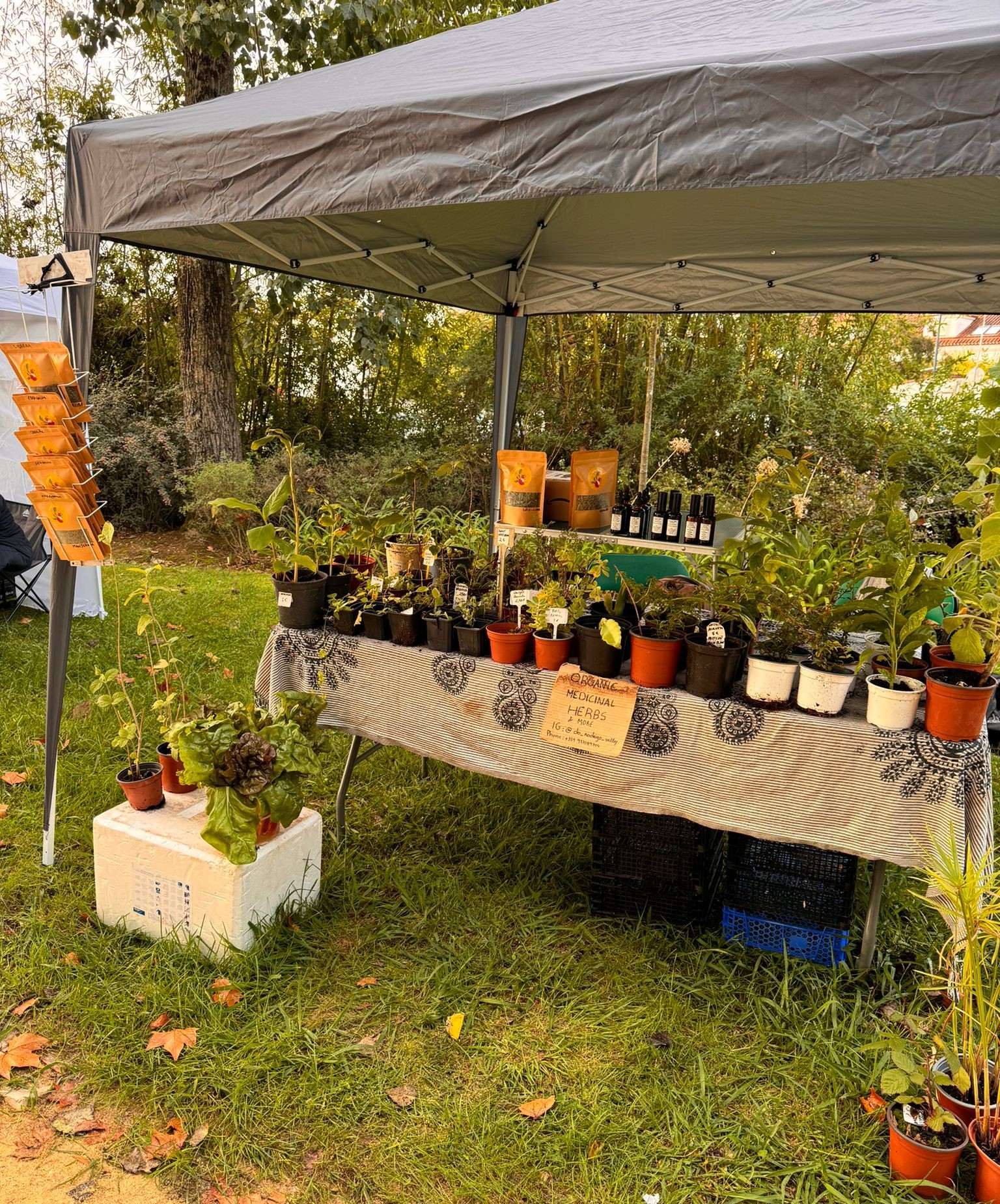 Cabazes vegetais, plantas em vaso e extratos herbais.